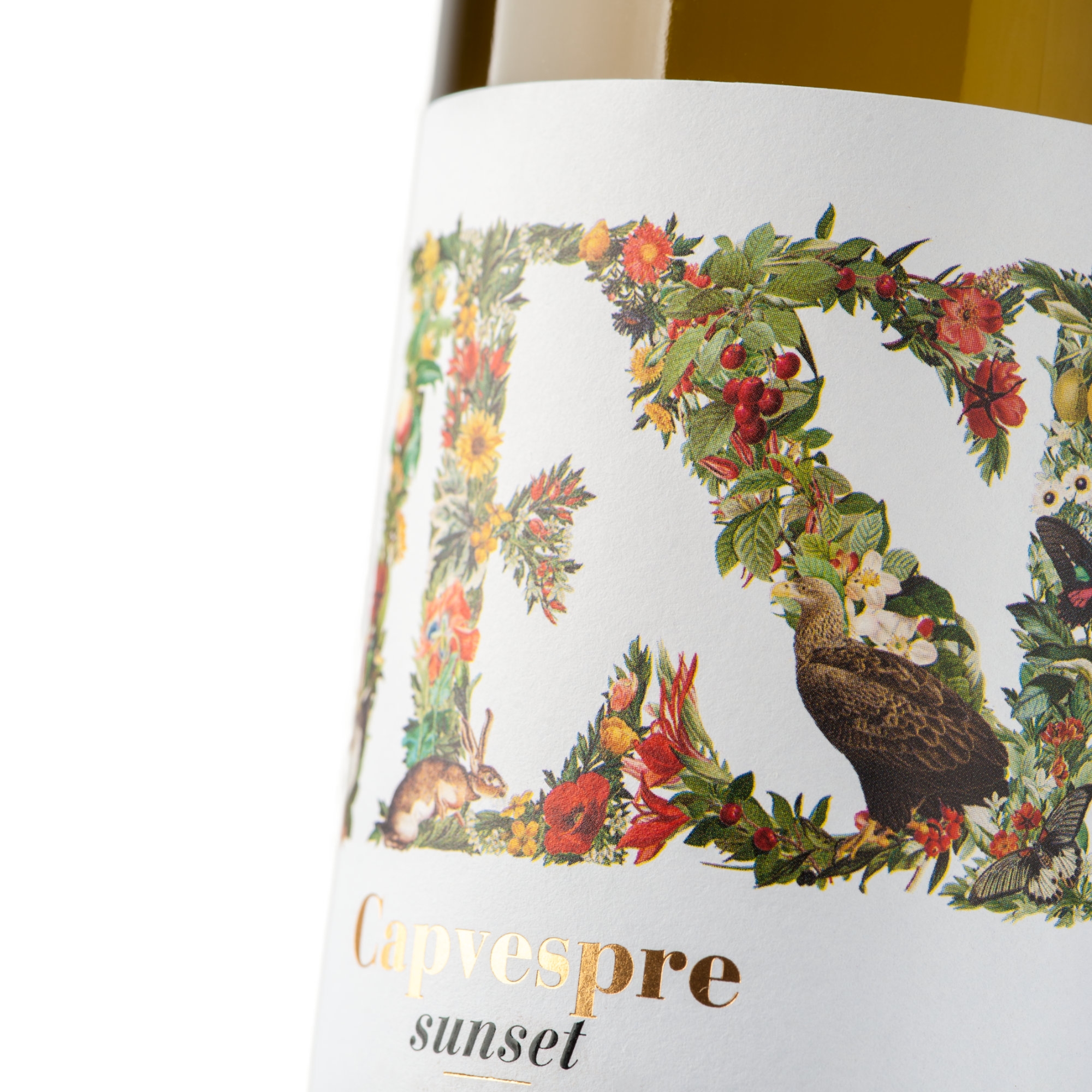 Vi blanc Capvespre Sunset Domenio Wines, elaborat amb la varietat anomenada xarel·lo, xacabeu i garnatxa Blanca, vi intens i aromàtic.