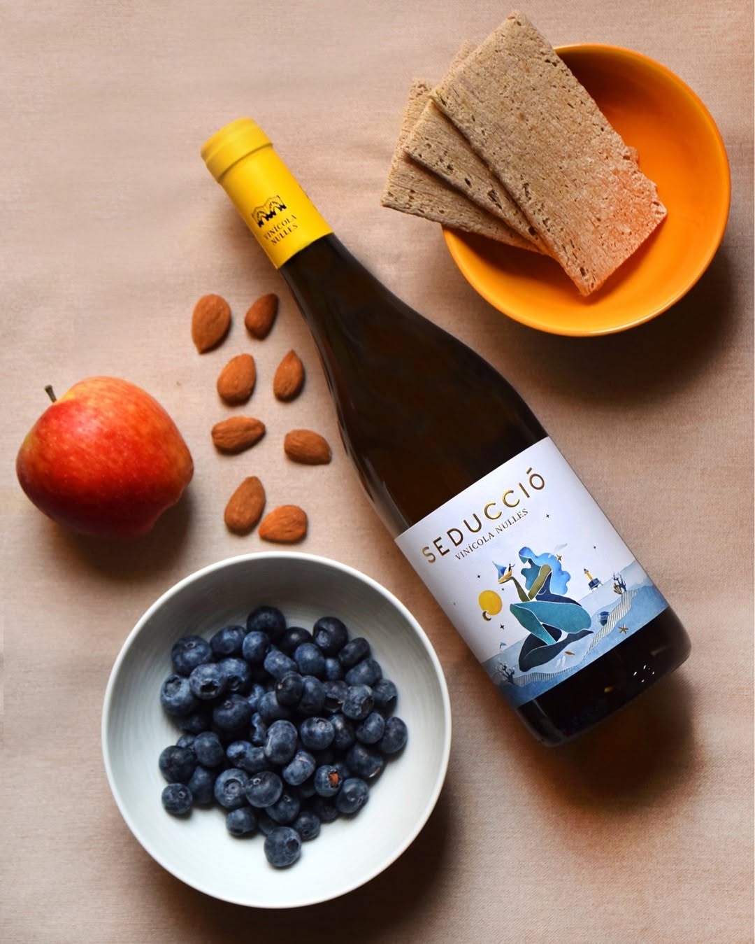 Vi blanc eco Seducció Vinícola Nulles, elaborat amb la varietat anomenada moscatell, xarel·lo, chardonnay, L’art de la seducció mediterrània.